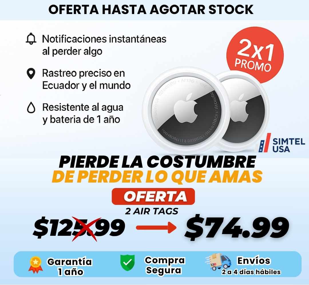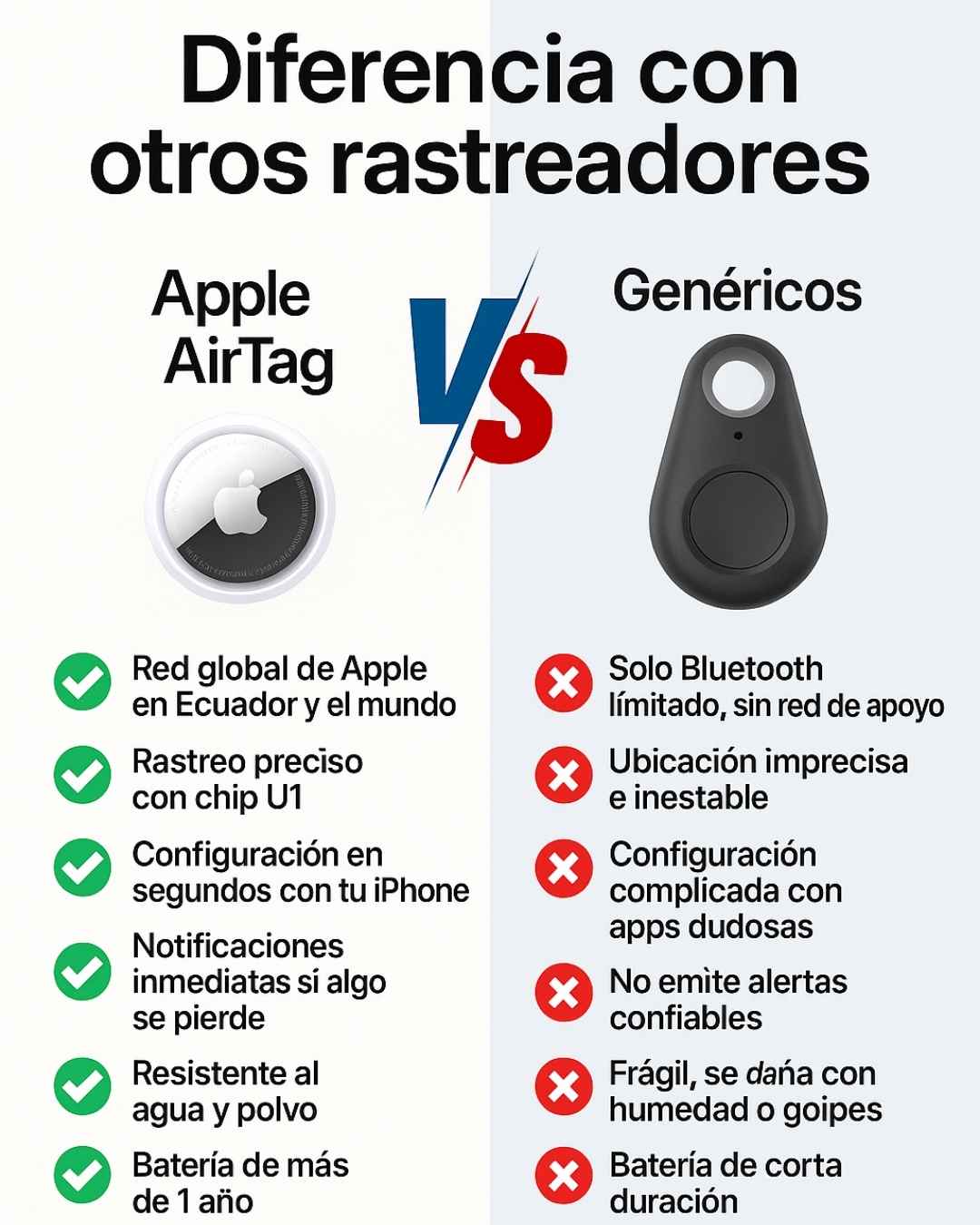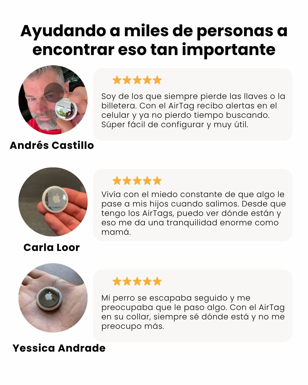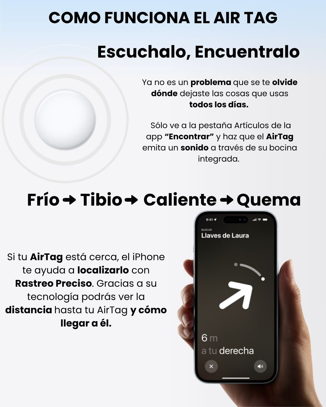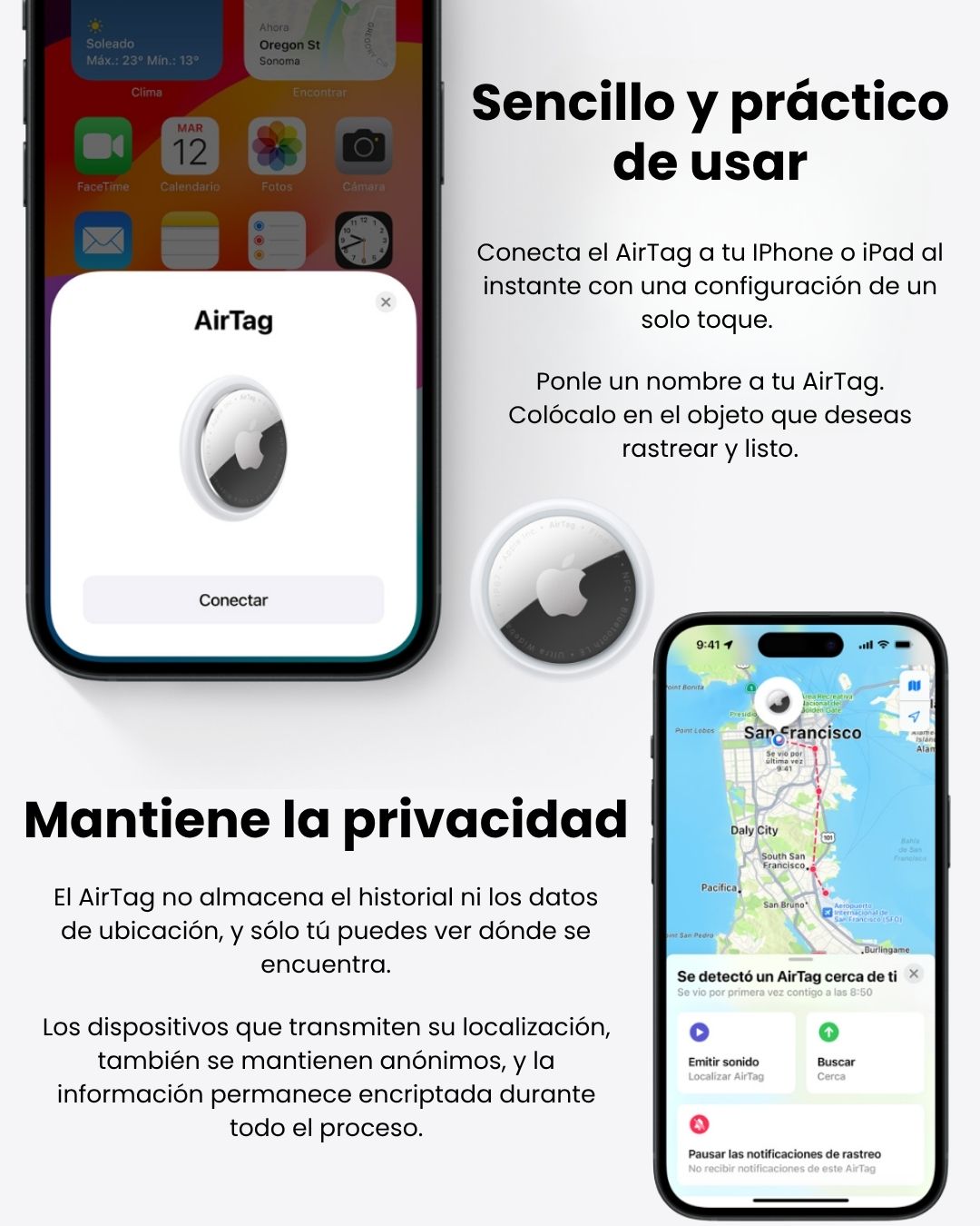 - El número de AirTags Apple originales según el pack que elijas (x2, x3 o x4) con su caja original.
